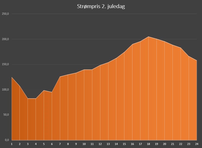 Prisen er imidlertid lavere nå enn hva den var for et år siden, da måtte vi betale 2 kroner og 61 øre for strømmen med avgifter på 2. juledag.
