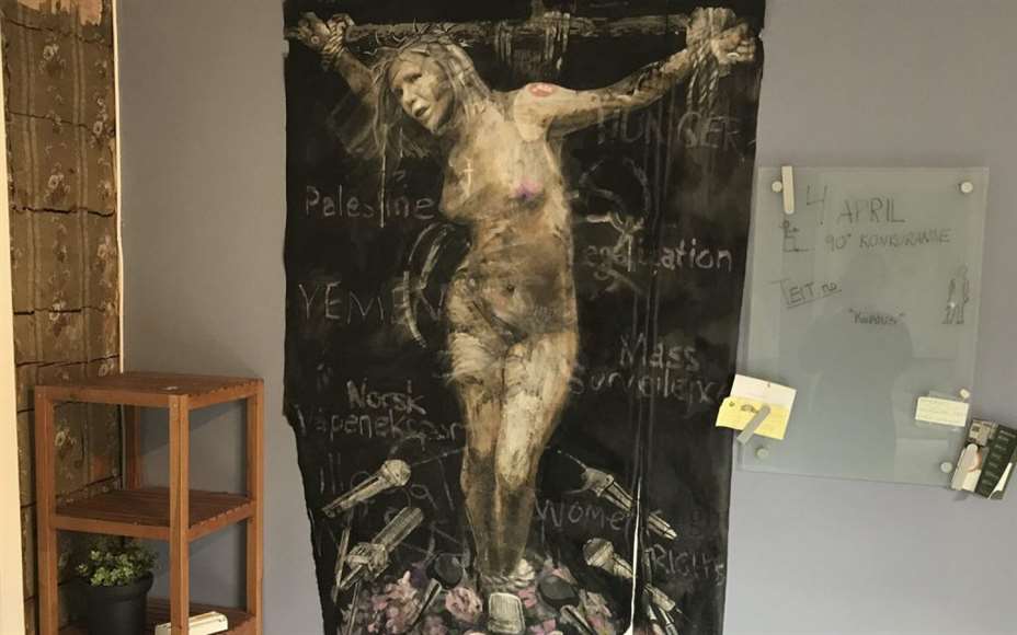 Dermed kan man trygt si at bildet av den korsfestede Sylvi Listhaug har gjenoppstått. Studentene forteller til Bergensavisen at de først forsøkte seg med både vodka, skurekrem og klor, før de fant ut at neglelakkfjerner fungerte utmerket.