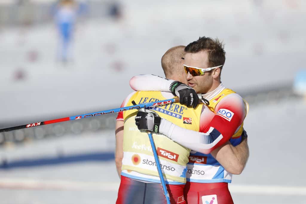 Sjur Røthe fikk selskap av Martin Johnsrud Sundby i VM-gullklubben onsdag. Etter målgang omfavnet de to hverandre lenge.