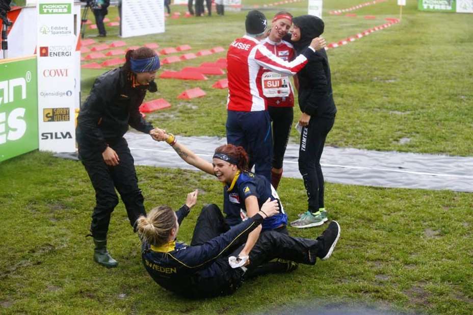 Sverige vant fire sekunder foran Sveits, 1.07 minutt foran Russland og 1.13 foran Norge i klissbløtt terreng i Spydeberg etter kraftig regnvær.