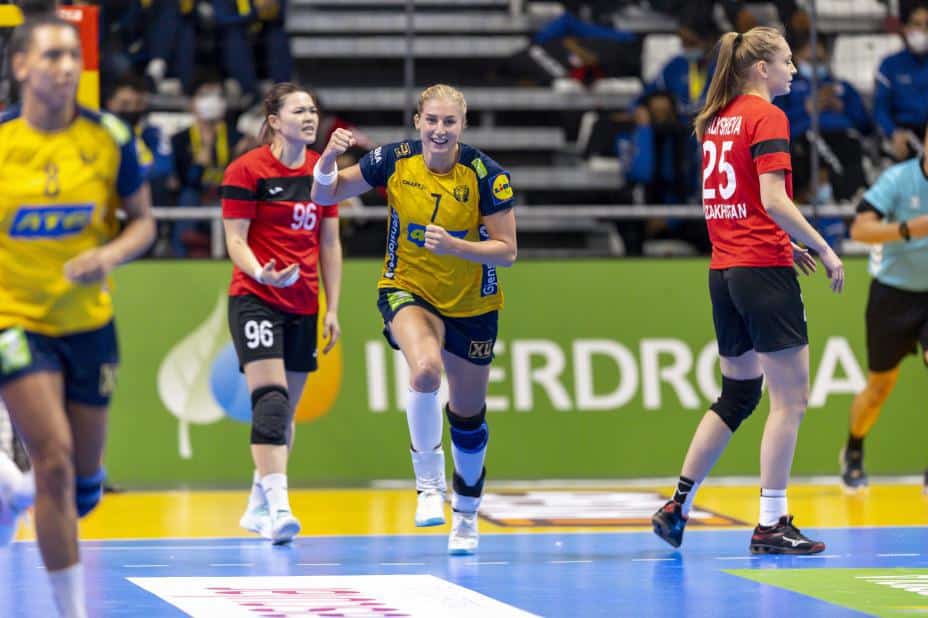 Sveriges Linn Blohm (nummer sju) må gjennom en røntgenundersøkelse i håndball-VM. Foto: Beate Oma Dahle / NTB