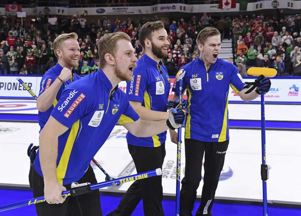 Niklas Edin (t.v.) og Sverige tok nok et VM-gull i curling søndag. Foto: Paul Chiasson / The Canadian Press via AP / NTB scanpix