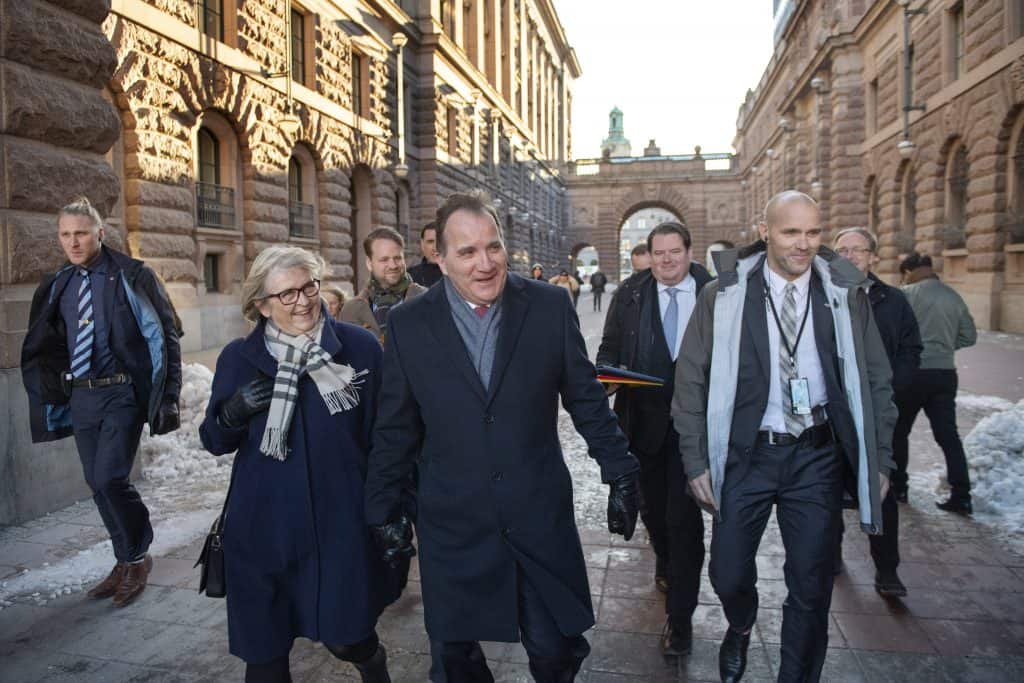 115 riksdagsmedlemmer stemte fredag for at Löfven får fortsette som statsminister, mens 153 stemte imot. Löfven ble imidlertid sikret seieren med 77 blanke stemmer, deriblant fra de to borgerlige partiene han nå skal samarbeide med, Centerpartiet og Liberalerna.