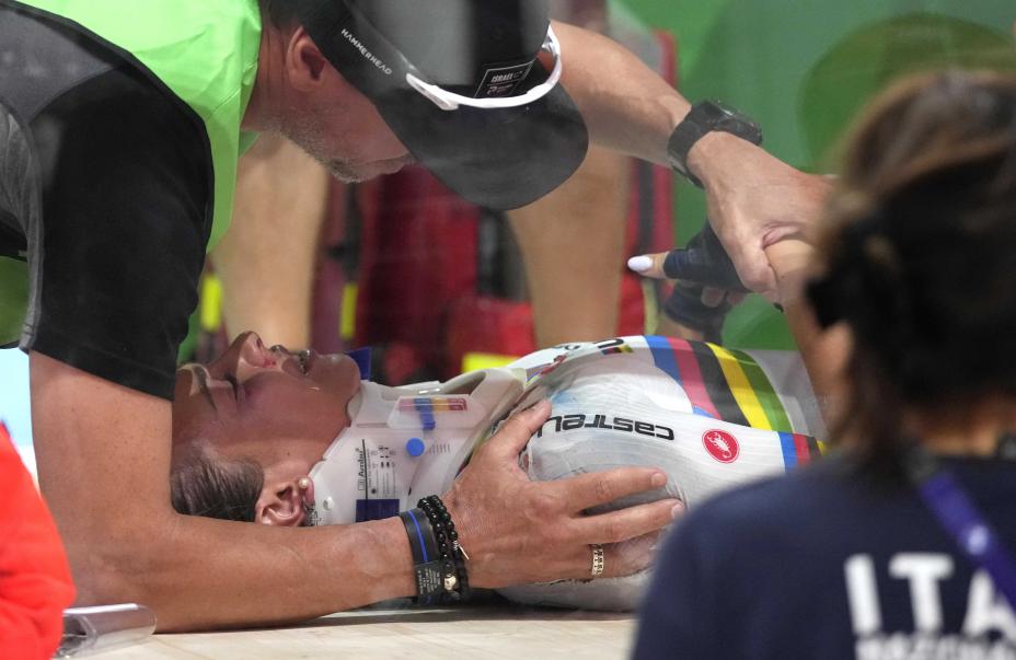 Den regjerende verdensmesteren skal fraktes hjem til Italia for å operere kragebenet. Ifølge det italienske forbundet husker ikke syklisten noe fra fallet.