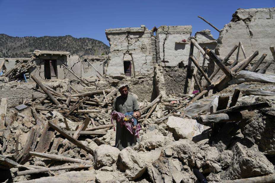 En afghansk mann med et barn i armene ser på ruinene av et hjem etter jordskjelvet i Paktika-provinsen. Foto: AP / NTB