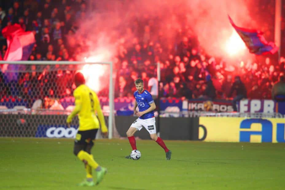 Sport: Ikke overraskende var det blussing før kamp både blant Kanarifansen og de tilreisende supporterne til Vålerenga. Et av blussene ble kastet ut på banen, og kampen måtte stoppes før minuttet hadde gått.