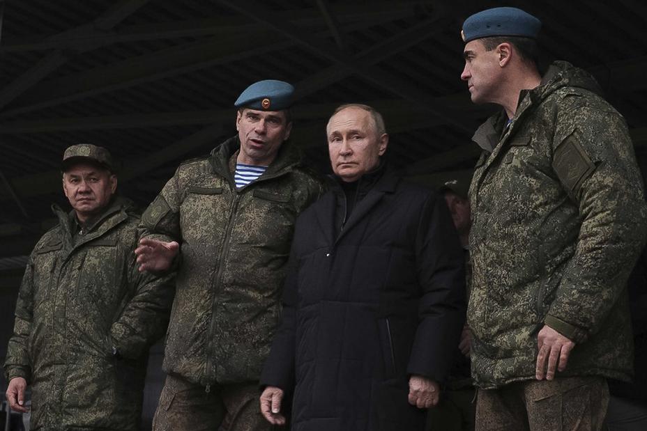 Russlands president Vladimir Putin med blant annet forsvarsminister Sergej Sjojgu (til venstre). Foto: Mikhail Klimentjev / Sputnik, Kreml / AP / NTB