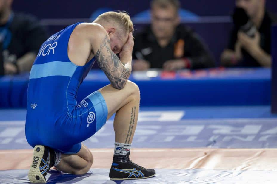 Berge gikk ned på kne i Jordal Amfi. Dersom Temirov kommer seg helt til finalen, får Berge bryte rekvalifisering om bronsefinale.