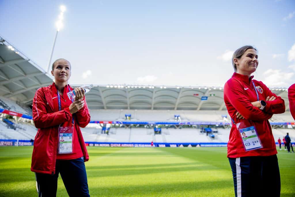 Guro Reiten og Emilie Haavi på Stade Auguste Delaune i Reims kvelden før VM-åpningen mot Nigeria. Foto: Stian Lysberg Solum / NTB scanpix