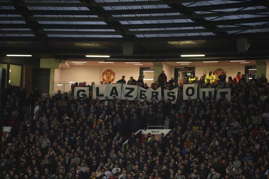 Det har i mange år vært sterk misnøye blant fansen mot Glazer-familiens som Manchester United-eiere. Her ble det markert med et banner på Old Trafford i 1-1-kampen mot Chelsea. I disse dager skjer det store endringer i internt i klubben. Foto: Dave Thompson / AP / NTB