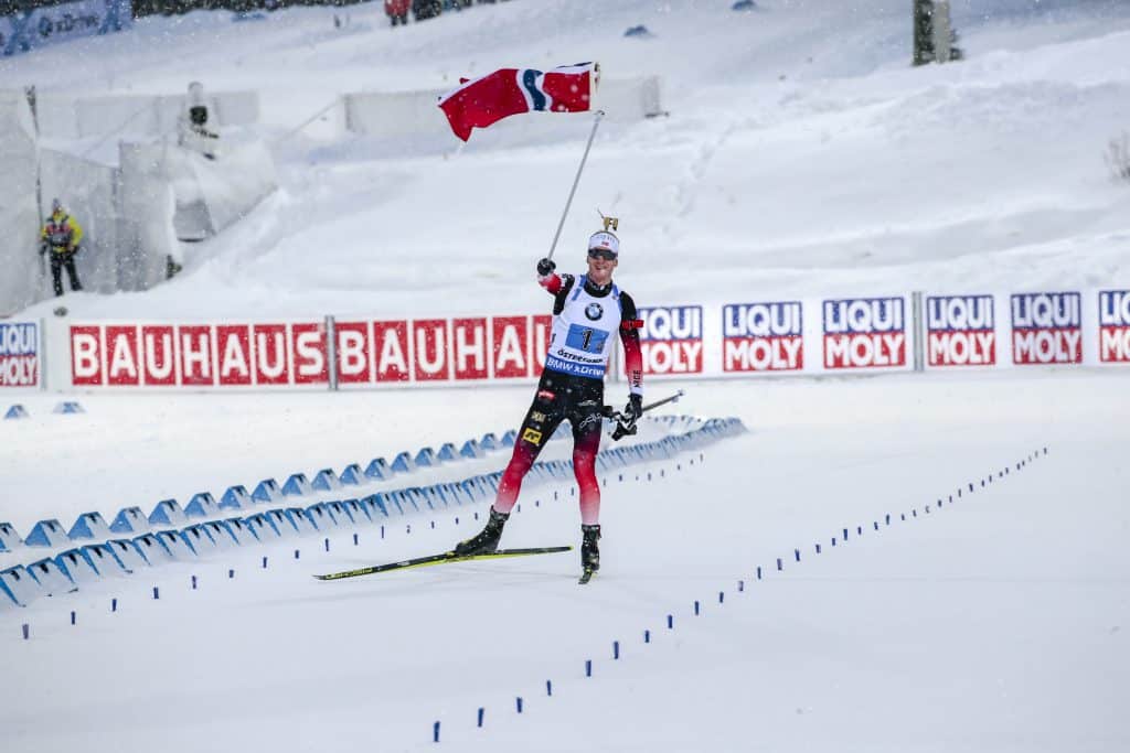 Johannes Thingnes Bø feirer med norsk flagg på vei inn til VM-gull i stafett. Foto: Lise Åserud / NTB scanpix