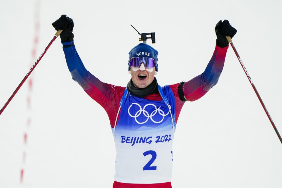 Johannes Thingnes Bø innn til gull på 15 kilometer i OL i Beijing sist vinter. Foto: Heiko Junge / NTB.