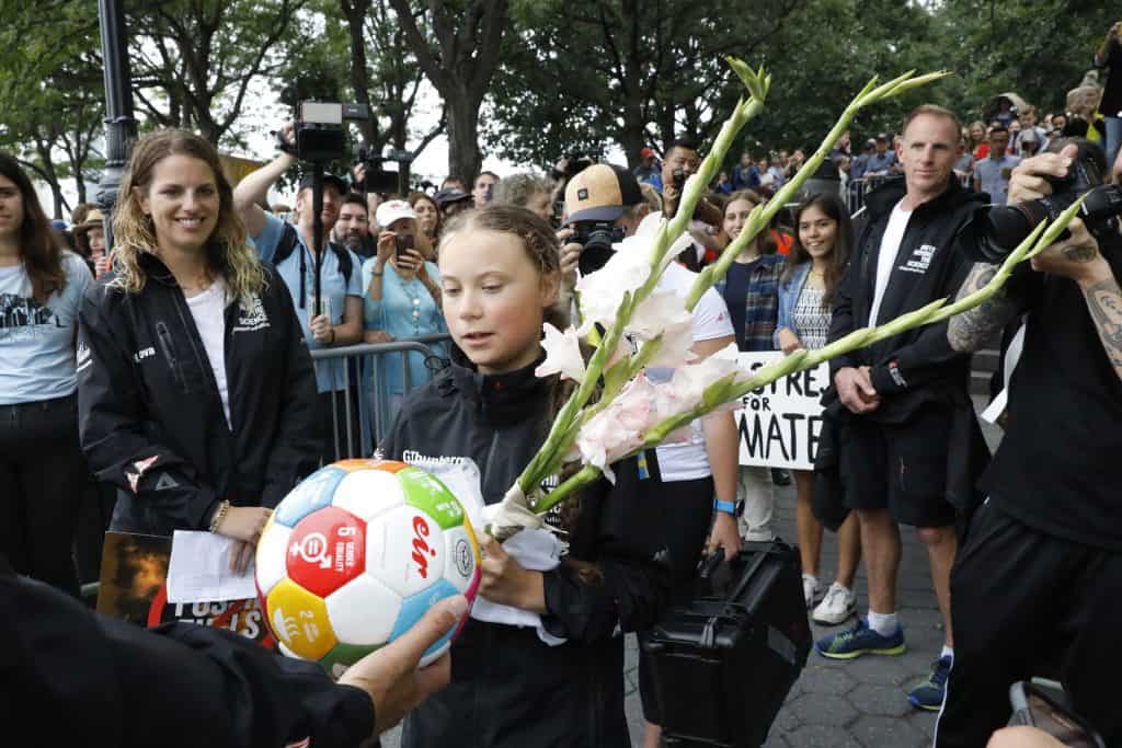 Greta Thunberg fikk blomster da hun ble møtt av tilhengere og miljøaktivister etter å ha kommet i land i New York. Foto: Mark Lennihan / AP / NTB scanpix