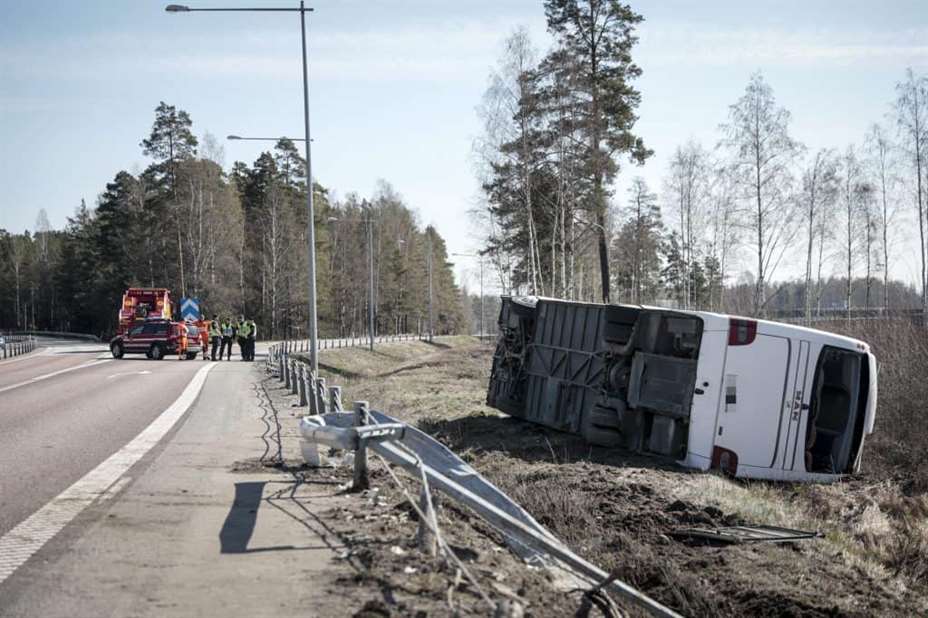 Turistbussen veltet og lå på siden utenfor veien. Ulykken skjedde på E18 mellom Berglunda og Adolfsberg i Örebro.