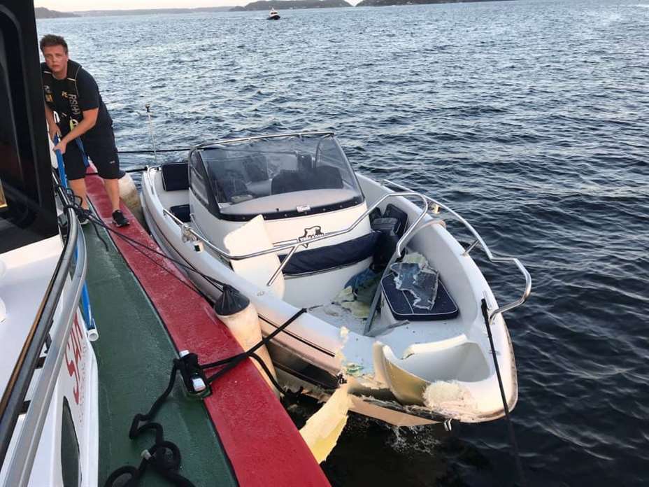 Politiet opplyser at det var en familie på fire fra Stathelle i båten. Ingen av dem falt i vannet som følge av sammenstøtet.