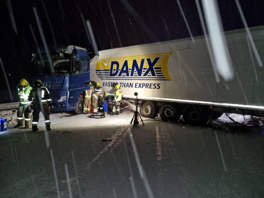 Det er to personer involvert, fører av hvert vogntog, og ingen av dem er skadd. Det er imidlertid store materielle skader på begge kjøretøyene, og tungberger er bestilt.