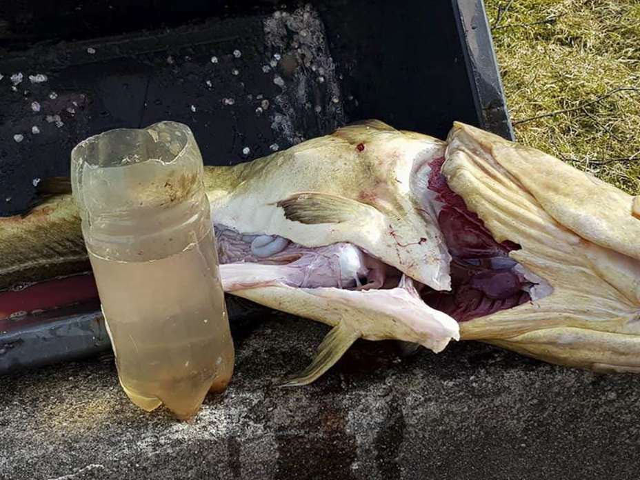 Da de to kameratene skulle trekke garn, fulgte en klukkende torsk med i fangsten. Den viste seg å ha slukt en avkuttet halvannen liters plastflaske.