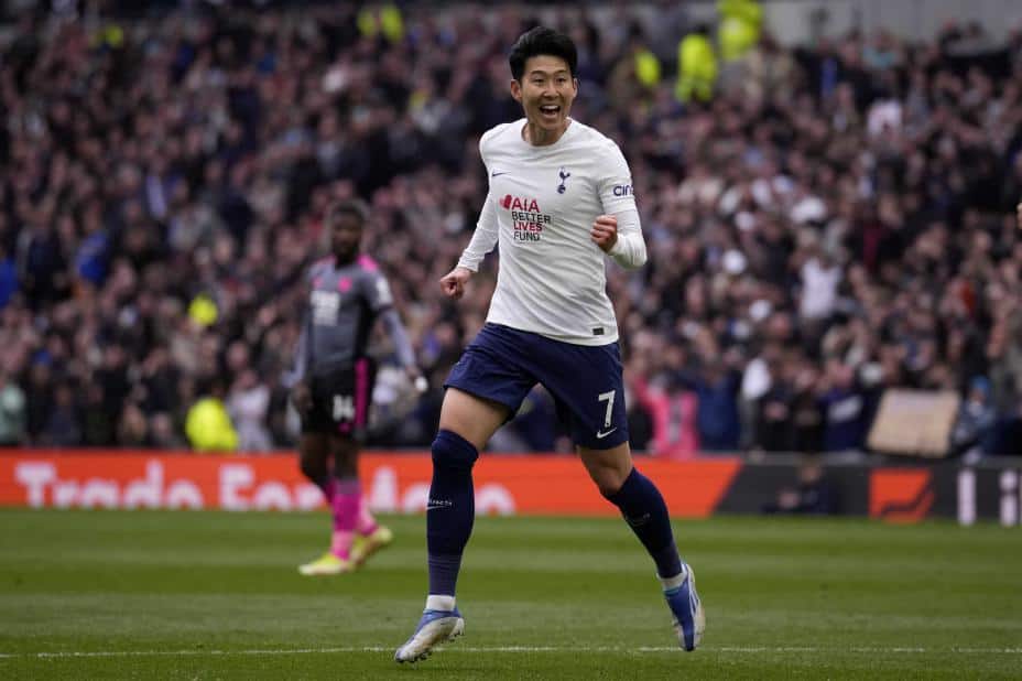 Tottenhams Son Heung-min var kampens gigant da de hvitkledde slo Leicester City 3-1 søndag. Foto: Matt Dunham / AP / NTB