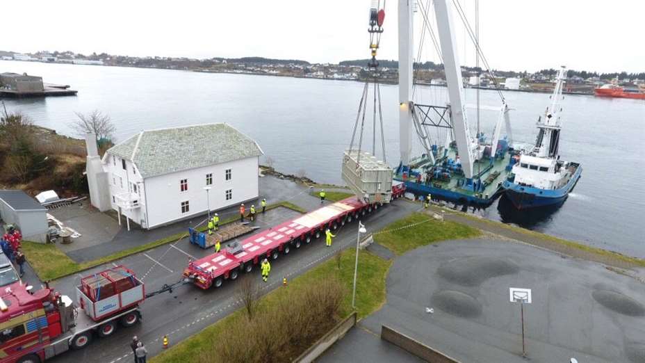 Den 400 tonn tunge transporten med en stor ny transformatoren er nå fraktet frem til kaien ved skolen.