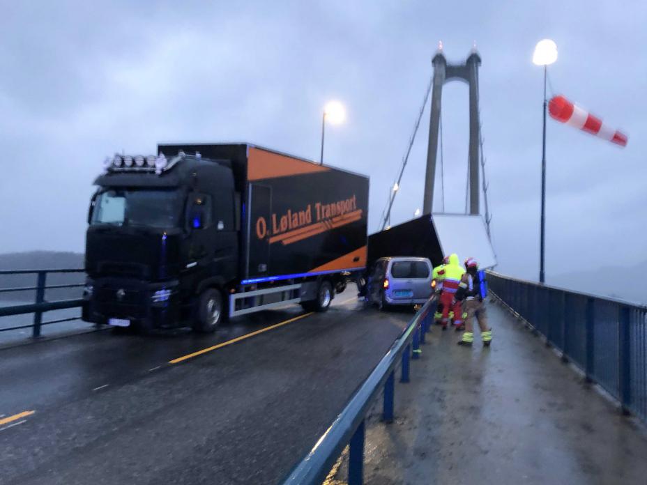 Operasjonsleder Helene Strand sa tidligere fredag ettermiddag til NTB at det blåste såpass mye på stedet at de knapt hørte patruljene. Hun kunne også fortelle at traileren sperret hele brua.