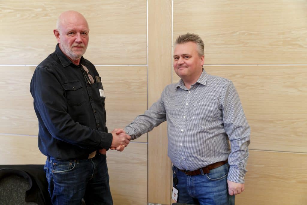 Norsk Transportarbeiderforbund vedtok under sitt ekstraordinære landsmøte onsdag å slå seg sammen med Fellesforbundet. Her er lederen i Transportarbeiderforbundet Lars Johnsen (t.v.) og leder i Fellesforbundet Jørn Eggum sammen da de signerte en avtale om sammenslåing i november i fjor. Arkivfoto: Cornelius Poppe/NTB scanpix.