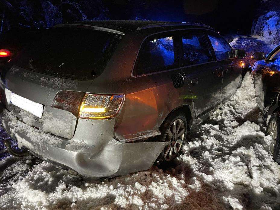 Politiet har beslaglagt førerkortet til sjåføren av bil nummer to, som blendet den tredje bilen. Politiet mener glatt veibane trolig var årsaken til at den første bilen kjørte av veien.