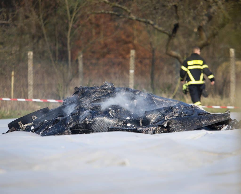 Kriminalitet og rettsvesen: Svartbrente vrakrester er spredt i 20 meters radius på stedet der det seksseters småflyet traff bakken ved tettstedet Erzhausen rundt klokken 14.30 søndag ettermiddag.