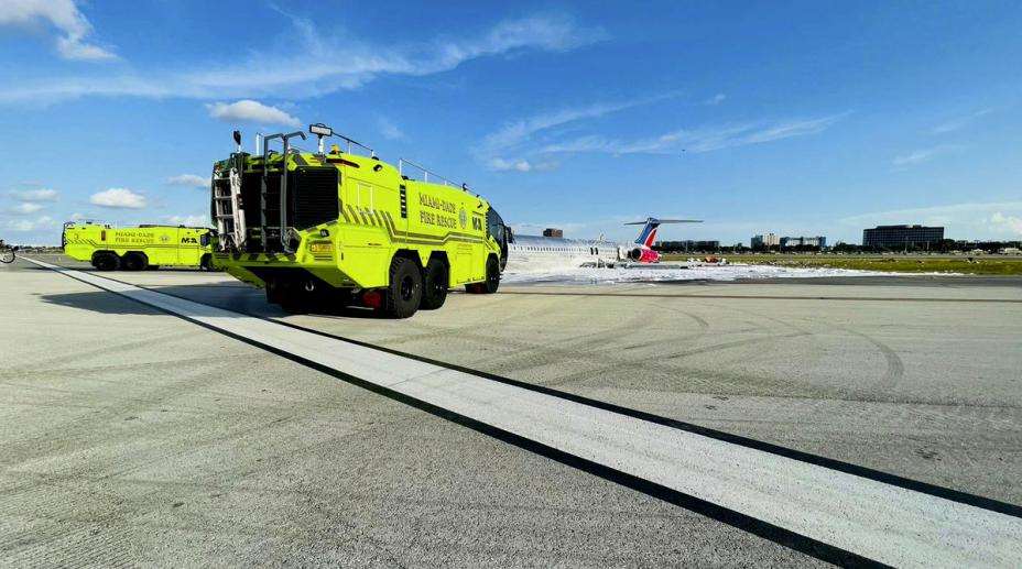 Tre personer ble skadd da et fly tok fyr etter å ha landet på den internasjonale flyplassen i Miami tirsdag.