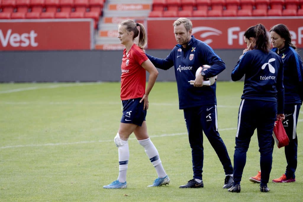 Caroline Graham Hansen fikk et smell i kneet under kvinnelandslagets trening mandag og ble liggende, men avblåste selv dramatikken.