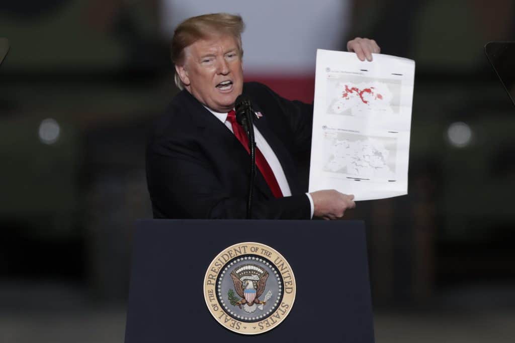 Krig og konflikter: Det var en svært selvsikker uttalelse fra Donald Trump, som i en tale i Lima i Ohio hevdet at Den islamske statens IS’ siste enklave i Syria ville bli befridd onsdag kveld amerikansk tid. Trump foldet ut utskrifter av kart der IS’ tilstedeværelse i Irak og Syria var markert med rødt for å illustrere hvordan områdene den har kontrollert gradvis har blitt tatt tilbake siden 2016.