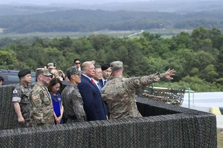 Den amerikanske presidenten ble først tatt med til en utkikksplattform på sørkoreansk side, der Moon orienterte ham om den demilitariserte sonen (DMZ).