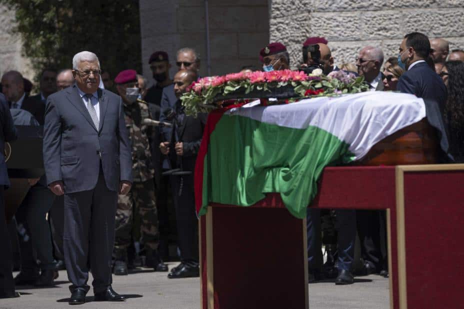 Palestinas president Mahmoud Abbas viste torsdag den drepte Al Jazeera-journalisten Shireen Abu Akleh den siste ære under en offisiell seremoni i Ramallah på den okkuperte vestbredden. Foto: AP / NTB