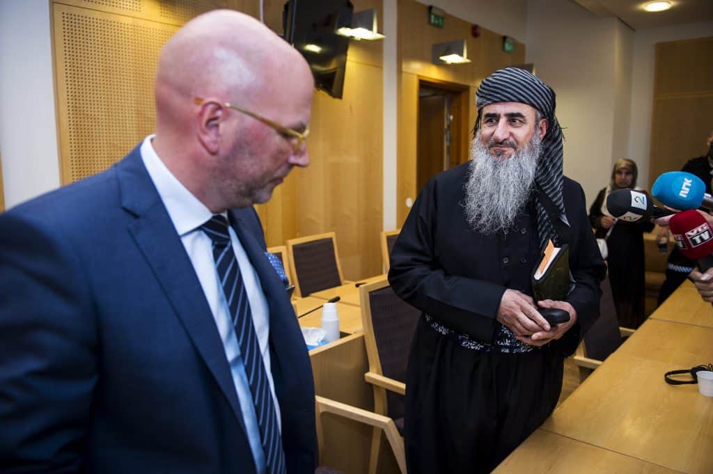 Advokat Brynjar Meling og mulla Krekar etter fengslingsmøte til mulla Krekar i Oslo tingrett 17. juli. Foto: Carina Johansen / NTB scanpix