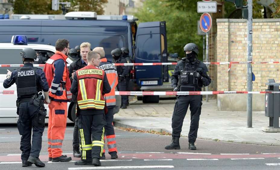 Politimenn og medisinsk personell foran en jødisk gravplass i Halle i Tyskland, der to personer ble drept i et angrep ved en moske onsdag. Den angivelige gjerningsmannen sendte angrepet direkte på kringkastingstjenesten Twitch. Foto: Jens Meyer / AP / NTB scanpix