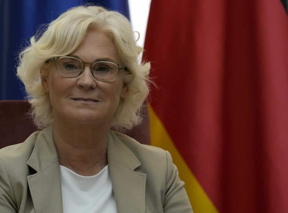 Tyskland gir sju selvdrevne haubitser til Ukraina, opplyser forsvarsminister Christine Lambrecht under et besøk til Sliac i Slovakia.