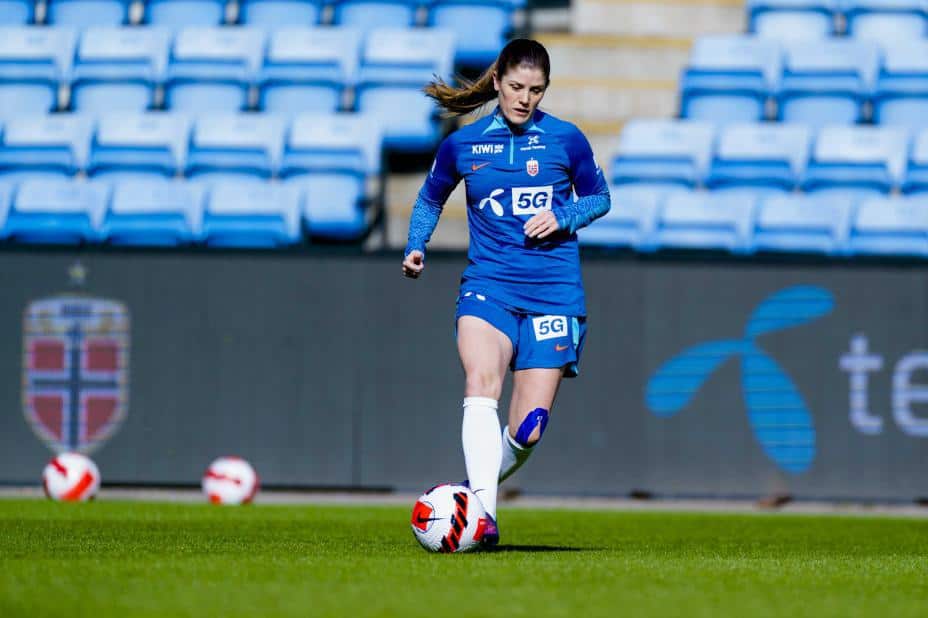 Nylig koronasmittede Maren Mjelde deltok ikke i fotballkvinnenes fellestrening på Ullevaal stadion mandag.
