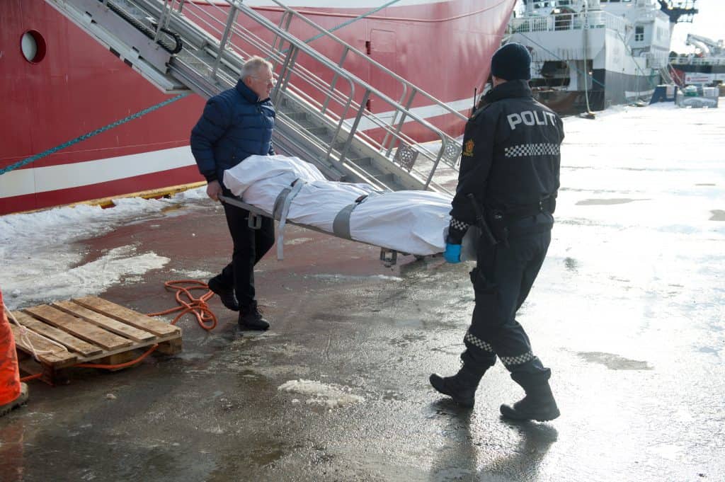 Representanter fra et begravelsesbyrå og politiet på kaia i Båtsfjord henter liket som ble fanget opp av reketråleren Remøy i Barentshavet. Foto: Inge Wahl / NTB scanpix
