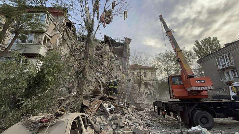Starukh skriver at sju russiske raketter traff et boligområde og at fem personer er innesperret i ruinene.