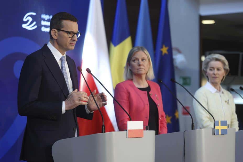 Polens statsminister Mateusz Morawiecki (t.v.), Sveriges statsminister Magdalena Andersson og EU-kommisjonens leder Ursula von der Leyen (t.h.) under giverkonferansen for Ukraina i Warszawa torsdag. Foto: Michal Dyjuk / AP / NTB