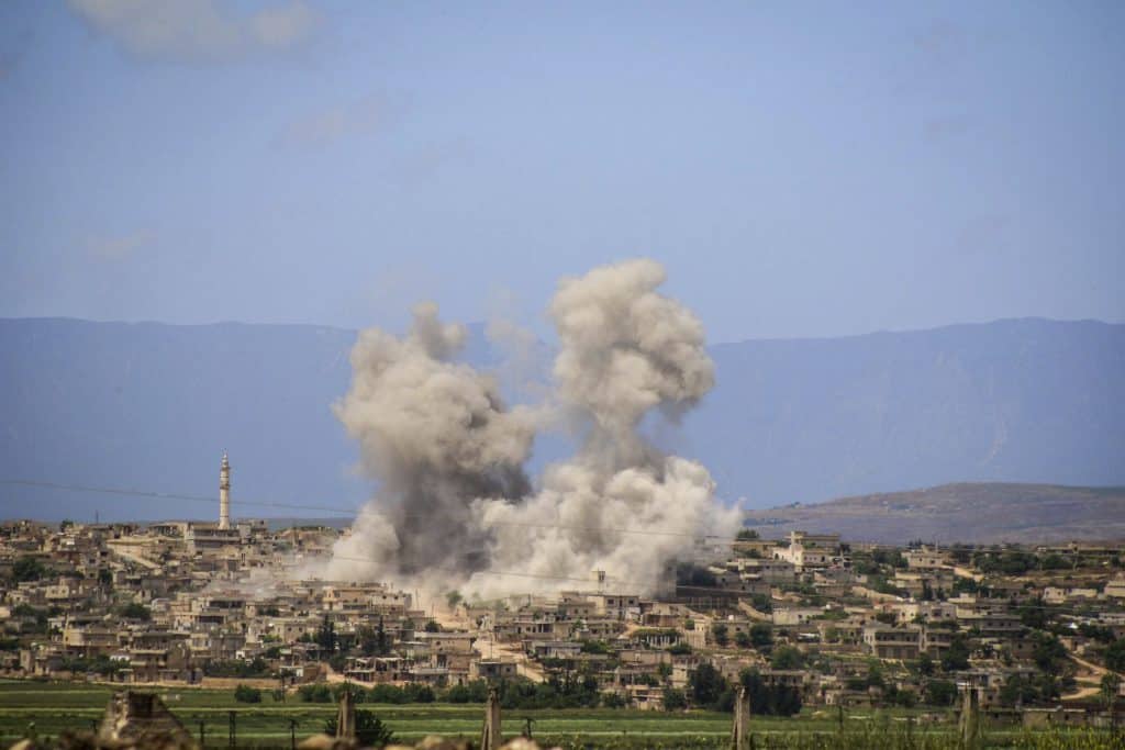 Bilde fra et angrep fra russiske og syriske fly over byen Idlib nordøst i Syria i begynnelsen av mai. Tirsdag sa amerikanske myndigheter at de mistenkte syriske regjeringsstyrker for å ha begått et kjemisk angrep mot byen hvor opprørere fremdeles har kontrollen. Foto: AP / NTB scanpix