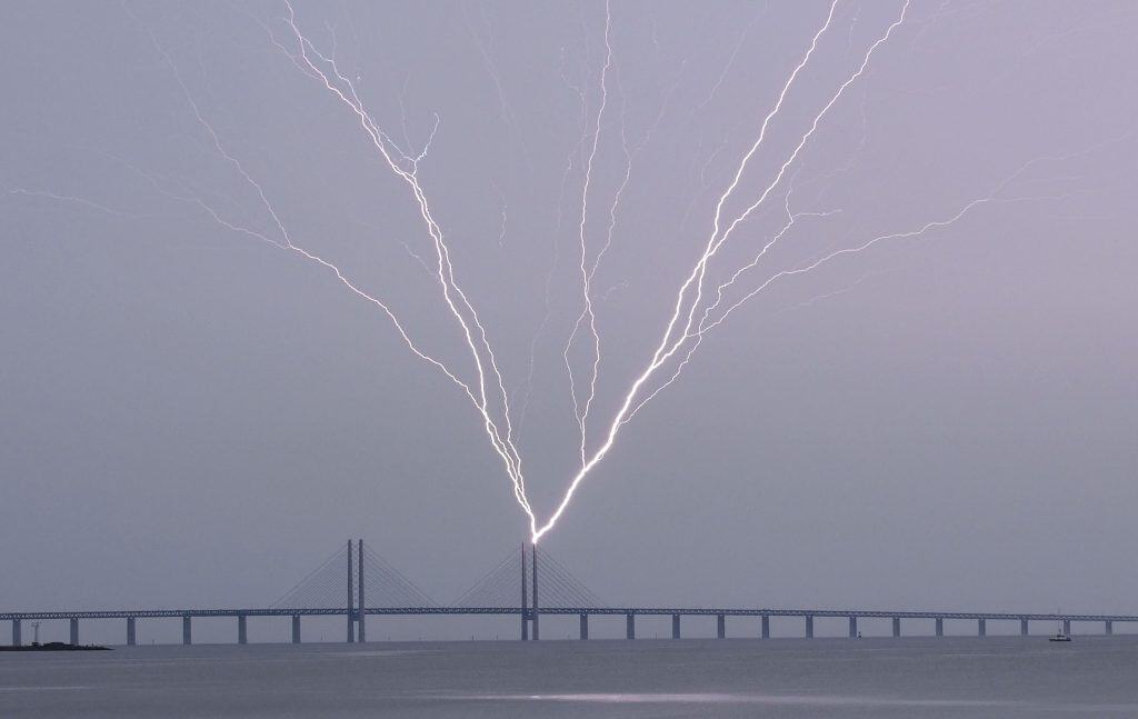 Lynet slo også ned i Øresundsbroen. TT-fotograf Johan Nilsson fikk fanget øyeblikket.