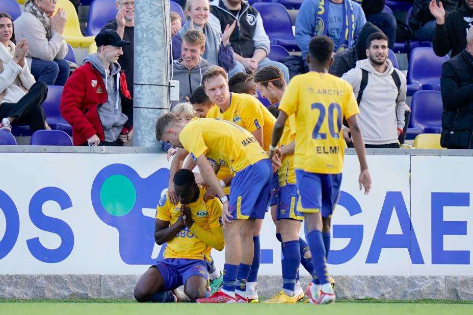 Omar Bully (sittende på kne) omfavnes etter en Grorud-scoring mot Lillestrøm i cupen i 2021. Foto: Stian Lysberg Solum / NTB