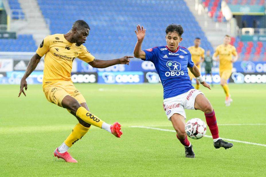 Bodø/Glimt-spiller Gilbert Koomson i duell med Vålerengas Osame Sahraoui i fotball-NM onsdag. Foto: Beate Oma Dahle / NTB