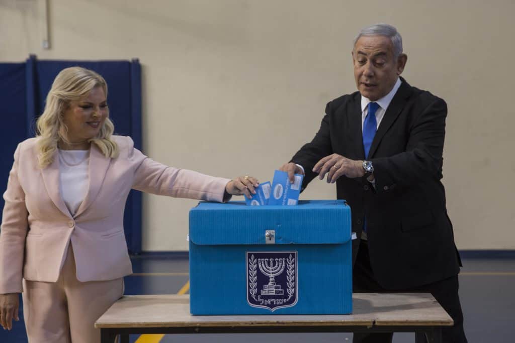 Israels statsminister Benjamin Netanyahu og kona Sarah stemte i Jerusalem tirsdag. Valget kan avgjøre om Netanyahu beholder makten eller om han straffeforfølges for korrupsjon. Foto: Heidi Levine, Sipa, Pool via AP / NTB scanpix