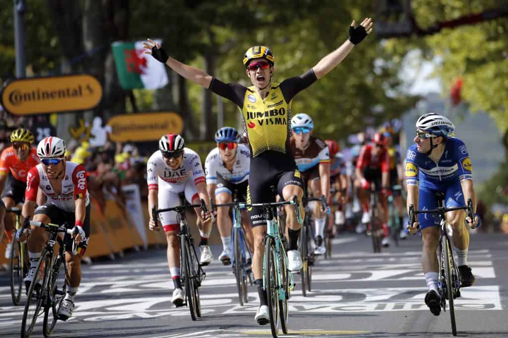 Sport: Belgiske Van Aert holdt unna for italienske Elia Viviani på oppløpet og sikret Jumbo-Vismas fjerde etappeseier av ti mulige så langt i rittet.