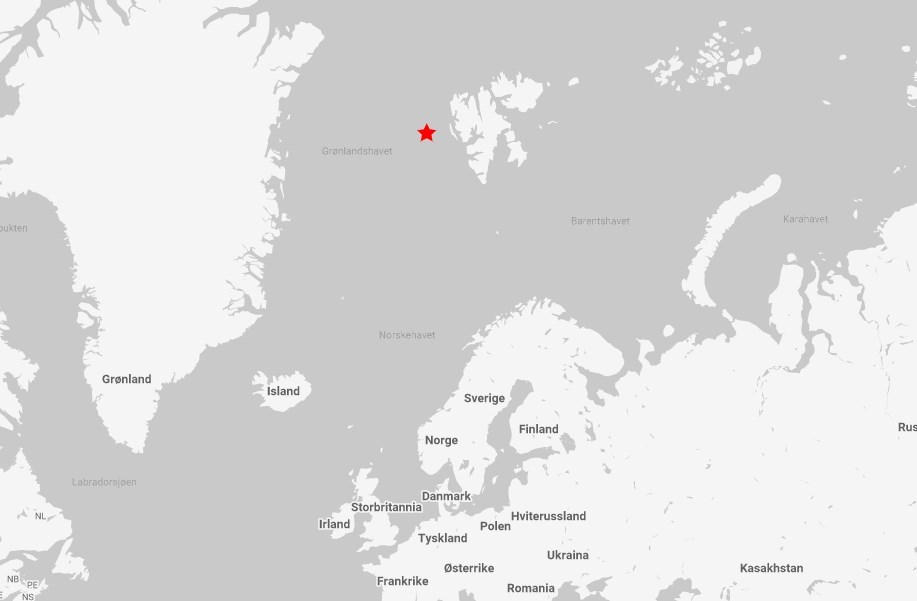Estimert episenter er omtrent 220 km vest for Longyearbyen.