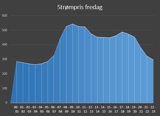 Den laveste prisen natt til fredag vil ligge på 3,7 og den høyeste prisen vil inntreffe i morgentimene med 7,6 per kilowattime.
