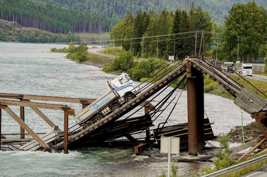 Ti år gamle Tretten bru kollapset 15. august og falt ned i Gudbrandsdalslågen. Foto: Heiko Junge / NTB