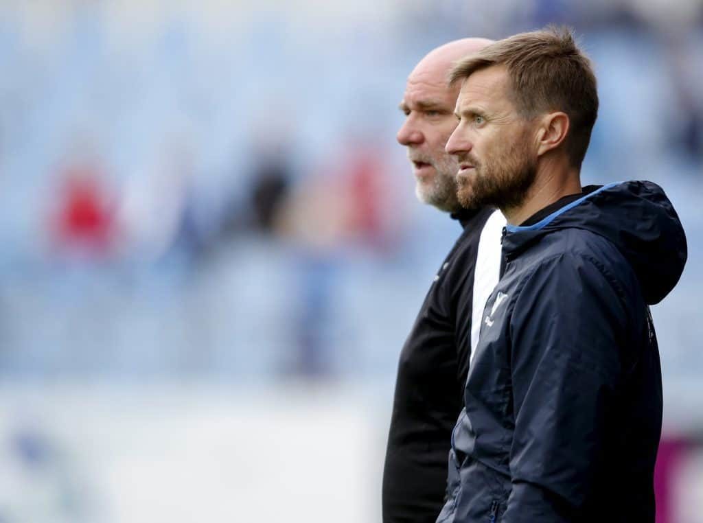 EMBED START Image Trener Eirik Horneland (t.v.) og assistenttrener Karl Oskar Emberland ledet treningen til FK Haugesund mandag. Begge har skrevet under for Rosenborg, men Haugesund vil ha godt betalt for å slippe dem. Foto: Jan Kåre Ness / NTB scanpix EMBED END Image