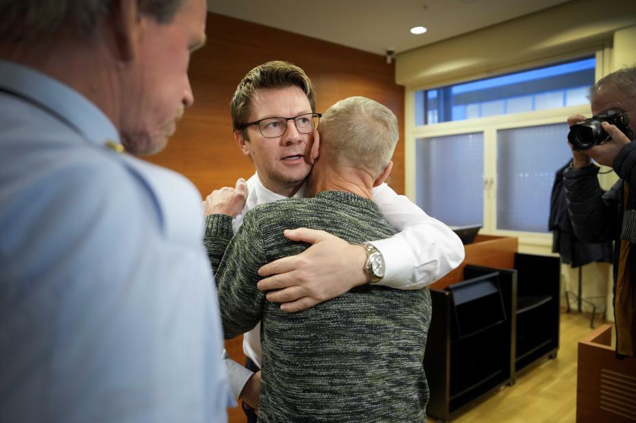 Kriminalitet og rettsvesen: Etter at dommen ble lest opp, fikk far Svein Kristiansen en god klem av advokat Bjørn André Gulstad. Bror Trond Kristiansen sa til VG at han var rørt.